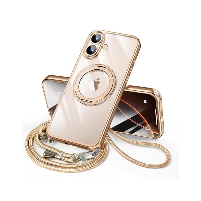商品名:iPhone 16 用 ケース ダブルリング付き ショルダー ストラップ付き 多機能360度回転スタンド MagSafe対応 ワイヤレス充電対応 耐衝撃 カメラレンズ保護 両眼 6.1インチ いphone16 用 ケース 薄型 透明 PC + 軽量 シリコン TPUバンパー おしゃれ スマホケース (さきん, iPhone 16)