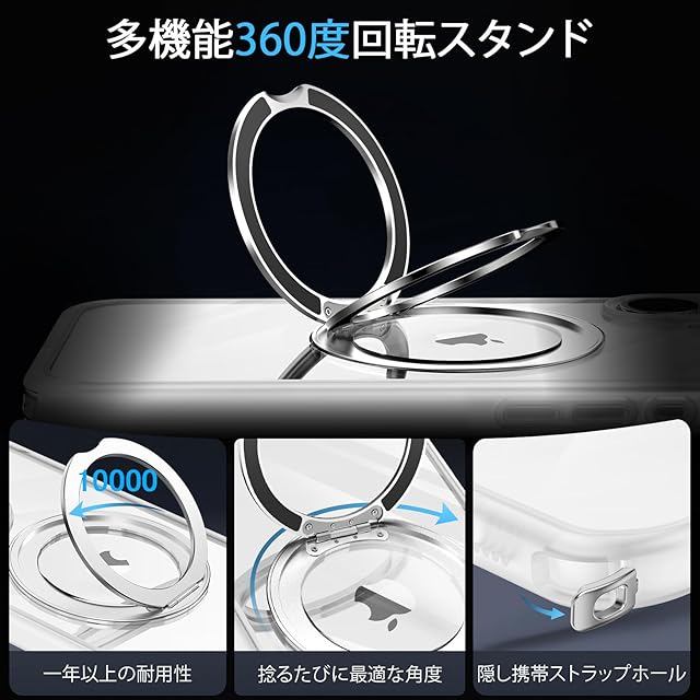 【360度多機能スタンド】多機能スタンドがあれば、映画鑑賞時にはデバイスを横向きにして快適に楽しむことができ、縦向きにすればオンライン学習や仕事を効率的に進めることができます。使いやすさも抜群で、好みに応じて簡単に角度を調整でき、垂直・水平のどちらに配置しても安定したサポートを提供します。角度調整は40°から120°まで自在に行え、外出先でも気軽に使えるため、リラックスした時間を過ごせます。また、リングやスタンドを別途持ち歩く必要がなく、隠しスタンドの設計により、省スペース性にも優れています。収納時には水平に置くことができ、持ち運びの際にも邪魔になりません。**ご注意:360°回転可能なスタンドリングですが、使用時には外部に引っ張るような力で回転させないようにしてください。