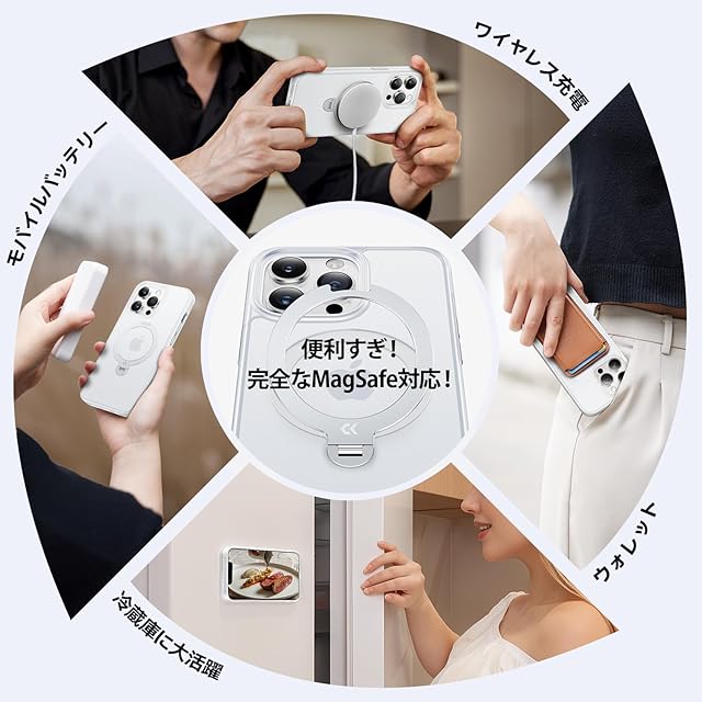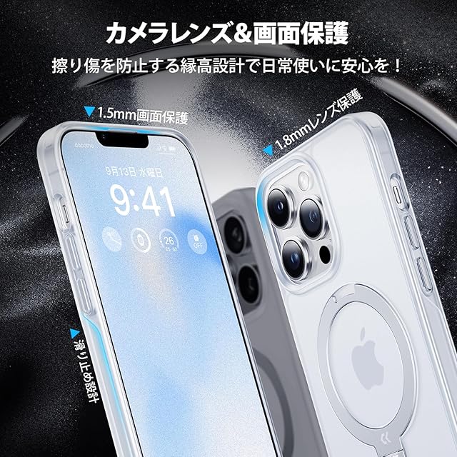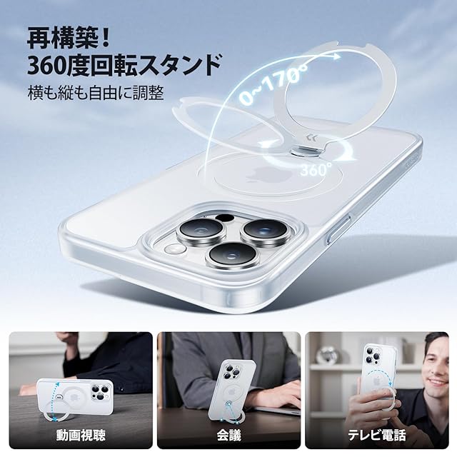 【驚くほど進化した360度回転スタンド技術】MagSafeスタンドの角度調整時の横置きの耐久性悪いと言う欠点を完璧に解消しました!弊社の最新技術によって、進化した独創的な新しい360度の回転軸を採用することによって、リングの耐久性が格段に向上し、縦の角度を0°~170°に無階段調節になり、スタンド機能をお好みの角度に調整できます。スタンドを使ってスマホを縦にしても横にしてもしっかりと支えることができます。自然な姿勢で、YouTube、映画、動画視聴やテレビ電話など楽しめます。。対応機種:iPhone 13 ProMax用 ケース