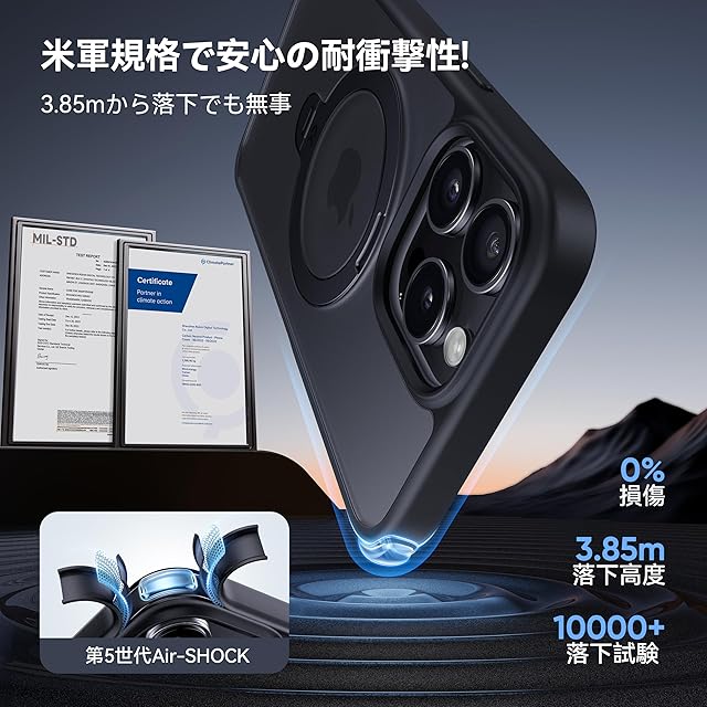 【強力な耐衝撃性&落下の心配なし】硬度・耐衝撃性が’非常に高いポリカーボネート素材採用。過酷な米国国防総省の耐衝撃試験「MIL-STD-810G」認証クリアし、特別な振動低減技術と三重耐衝撃構造、ケースの四隅に独自のU-AIRクッションを搭載することにより、衝撃吸収性能を20倍アップ!どのような角度の衝撃に対しても受け止めて大切なスマホをしっかりと保護!米軍MIL規格認証番号:GZMR220702237705|認証機関:CSTC Standards Testing Center|認証時間:Jul 20, 2022