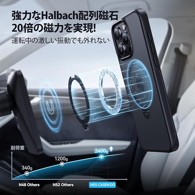 【磁力20倍!最強吸着力の両面マグネット式】MagSafeワイヤレス充電の時でも干渉しない!弊社独自のHalbach配列磁界閉鎖技術により、最大15W高速ワイヤレス充電ができ、超強力なN55磁石で吸着力は従来より20倍も高くなり、10000mAhの大容量モバイルバッテリーを付けていても簡単に落ちることはありません。MagSafe対応の車載ホルダーに装着した状態で、悪路の走行中でも落下の心配もなく快適です!さらに、両面マグネット式なので、冷蔵庫、お風呂、ジム、壁、キッチンなどの鉄部分に貼り付き、そのままハンズフリーで動画視聴も可能です。対応機種:いphone15pro maxケース