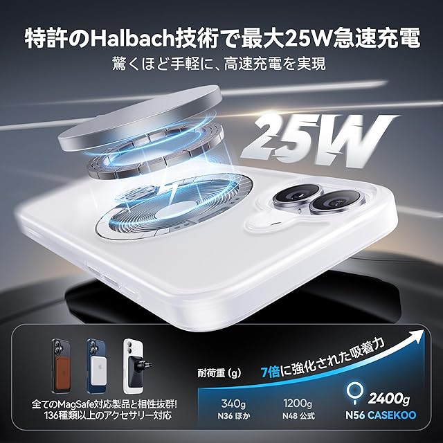 【世間を席巻したパワー・最大25W急速充電】内部に組み込まれた360度全周型のHalbach磁石配列により、業界屈指の強力な磁力を実現!これを通じて、スマホを確実に固定しながら、最大25Wの超高速ワイヤレス充電を提供します。車載ホルダーや鉄面に取り付けることで、どんな状況でも安定して使用でき。悪路での運転中や振動が激しい場面でも、スマホがずれる心配はありません。キッチンや浴室、外出時でも壁に取り付けてハンズフリーで動画視聴が楽しめます。N56マグネット磁石の圧倒的な吸着力で、どんな環境でも安心して利用できる万能なケースです。対応機種:iPhone16 ケース