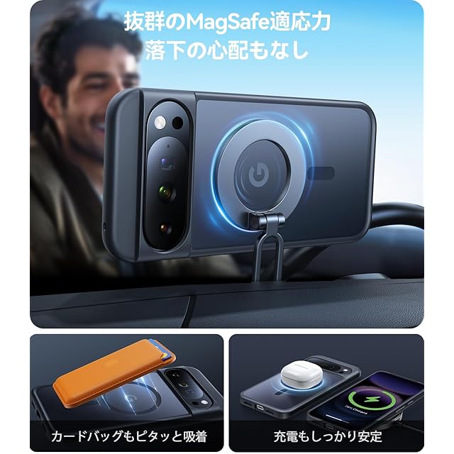 【えっ、こんなに速いの!? ワイヤレスで数分フル充電に!】面倒なケーブルとはさようなら、ワイヤレス充電がもっと楽に!このケースはN52 マグネットが搭載され、Magsafe 対応の各種アクセサリーと互換性がある。強力な磁力により、車載ホルダーやワイヤレス充電器にスムーズに吸着する。外出先でスマホの電池が切れそうになった時でも、Magsafe 対応のワイヤレス充電パッドに簡単に吸着して充電を開始できる。また、マグネットの耐久性にもこだわり、長期間の使用でも磁力が低下することはない。精密な設計により、磁石の配置が最適化されており、安定した吸着性能をする。磁界強度測定値18mT(ミリテスラ)は業界最高水準で、充電効率97%を維持。対応機種:google pixel 10 pro ケース