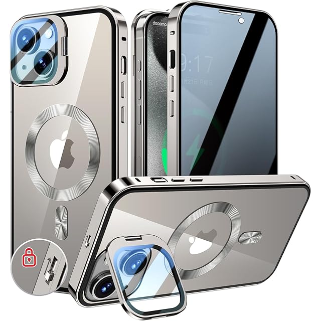 商品名:KELLCASE【カメラレンズ保護・スタンド+覗き見防止+MagSafe対応 】iPhone 15 用 ケース 全面保護 隠しスタンド付き ロック付き 両面 マグネット式 アイフォン 15 カバー ストラップホール付き透明背面 メタルフレーム 磁石 ワイヤレス充電対応 9H強化ガラス 高感度タッチ あいふぉん15 用 ケース 6.1インチ(グレー)