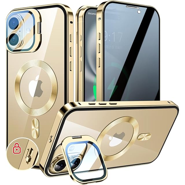 商品名:KELLCASE【カメラレンズ保護・スタンド+覗き見防止+MagSafe対応 】iPhone 16 Plus 用 ケース 全面保護 隠しスタンド付き ロック付き 両面 マグネット式 アイフォン16プラス カバー ストラップホール付き透明背面 メタルフレーム 磁石 ワイヤレス充電対応 9H強化ガラス 高感度タッチ あいふぉん16 plus 用 ケース 6.7インチ(ゴールド)