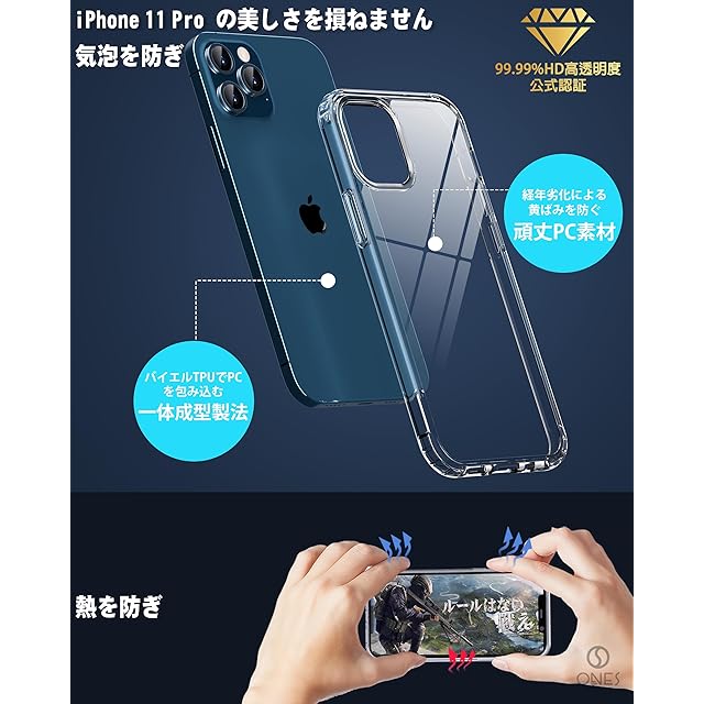 ONES HD全透明 iPhone 11Pro ハード ケース 米軍MIL規格 超耐衝撃 エアバッグ 〔 高靭性強化PCガードボード ? 高弾性衝撃吸収TPUバンパー 〕『 画面 ・ レンズ保護、Qi充電 』 滑り止め 超軽量 持ちやすい 美しい 黄変防止 クリア カバー