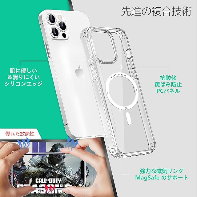 IPhone 12 Pro Maxのための高品質なハードケースです。MagSafe磁気吸着リングが搭載されており、iPhone 12 Pro MaxにMagSafe機能を追加し、MagSafe対応アクセサリーとの使用が可能になります。Qi無線充電にも対応しており、磁気吸着により安全に固定されます。ケースの縁は高く設計されており、画面とカメラレンズを保護します。四隅には衝撃吸収用のエアクッションが内蔵され、米国の軍事規格にも準拠しています。耐衝撃性のあるPCハードバックとTPU製の柔らかい側面部で構成され、落下時の衝撃から端末を守ります。背面にはスクラッチ防止コーティングが施されており、長期間の使用でも損傷しにくくなっています。高透明度で高品質な素材を使用しているため、長期間使用しても黄変しません。iPhoneの本来の色彩を忠実に再現しています。超軽量で薄型のデザインながら、滑り止め加工が施されたグリップ感の良い人間工学に基づいたフォルムで、手に馴染む快適な操作性を実現しています。