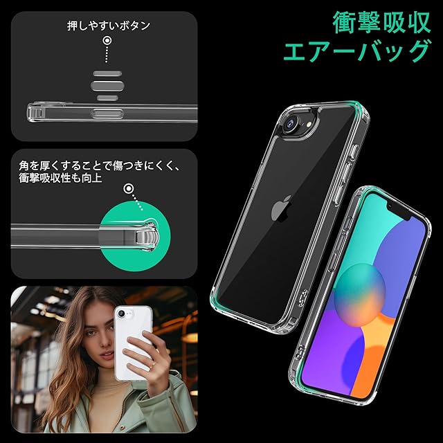 この iPhone 16e 用クリスタルクリアケースは、優れた保護機能と美しいデザインを両立させた製品です。PCハードバックとTPUバンパーの混合材質を採用し、耐衝撃性能を確保。四隅には衝撃を吸収するエアクッションを内蔵し、MIL規格に準拠した堅牢な設計となっています。画面と カメラレンズの周りは縁が高くなっており、置いた時の傷つきを防止。透明度の高い素材を使用することで、 iPhone16e の美しいデザインを損なうことなく保護できます。背面には耐スクラッチコーティングが施され、長期使用でも傷つきにくい仕様。軽量かつスリムなデザインで、手に心地よくフィットし、滑りにくい設計です。四隅の保護設計により、画面保護フィルムを貼った状態でも安心して平置きできます。長期使用でも黄ばみにくい高品質な素材を使用しており、 iPhone16e の美しい色彩を存分に楽しめます。