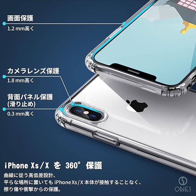 ONES HD全透明 iPhone Xs/X ハード ケース 米軍MIL規格 超耐衝撃 エアバッグ 〔 高靭性強化PCガードボード ✚ 高弾性衝撃吸収TPUバンパー 〕『 画面 · レンズ保護、Qi充電 』 滑り止め 超軽量 持ちやすい 美しい 黄変防止 クリア カバー