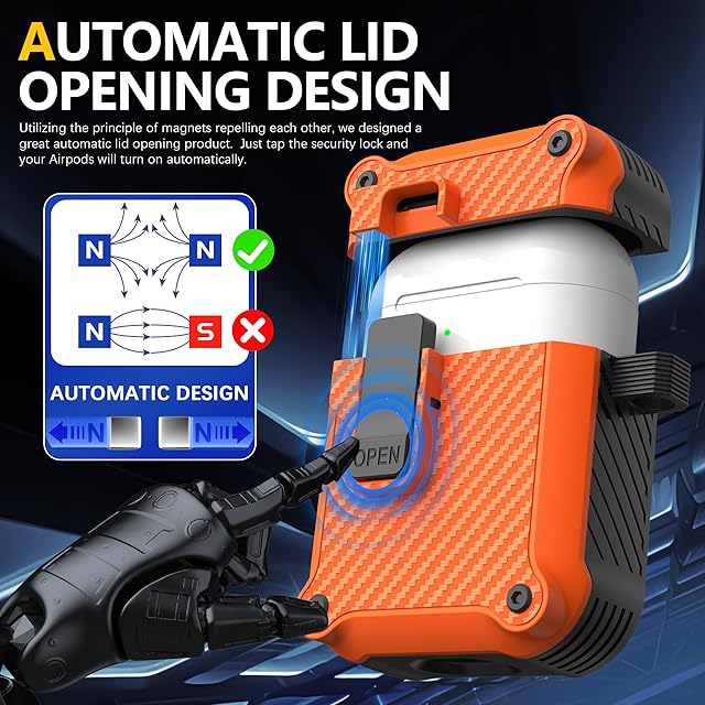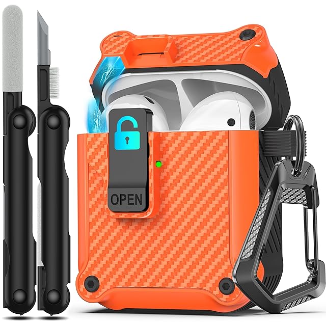 RFUNGUANGO Airpods 第 2 世代および第 1 世代保護ケース 安全ロッククリップ付き自動ポップアップ、キーチェーン付きフルボディ耐衝撃ハードケース (無料クリーニングツール) - カーボンファイバーオレンジ