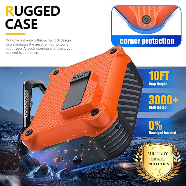 【ユニークなセキュリティロックと自動ポップアップ】アップグレードされたセキュリティロック設計により、開閉が簡単になります。「OPEN」ボタンを押すと、ケースの上部が自動的に開きます。 AirPods 充電ケースをしっかりと閉じた状態に保ち、カバーが落ちることを防ぎます。