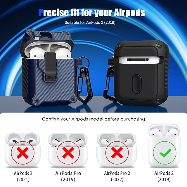 商品名:RFUNGUANGO Airpods 第 2 世代および第 1 世代保護ケース 安全ロッククリップ付き自動ポップアップ、キーチェーン付きフルボディ耐衝撃ハードケース (無料クリーニングツール) - ブルー