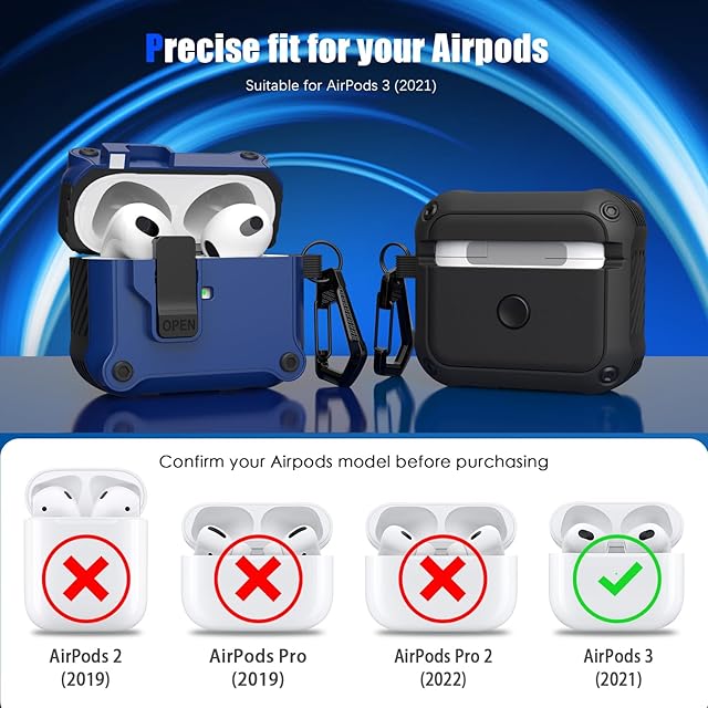 商品名:RFUNGUANGO Airpods 第 3 世代ケース 安全なロッククリップ付き、フルボディ耐衝撃ハードシェル保護、AirPods 3 ケース Apple AirPod 第 3 世代 2021 対応 [前面 LED 可視] - ブルー