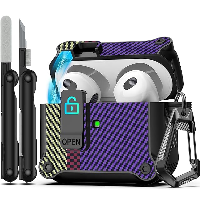 RFUNGUANGO Airpods 第 3 世代用ケース、安全なロック クリップ付き、フルボディ耐衝撃ハードシェル保護、 AirPod 第 3 世代 2021 用 AirPods 3 ケース [フロント LED 可視] - カーボンファイバー パープル