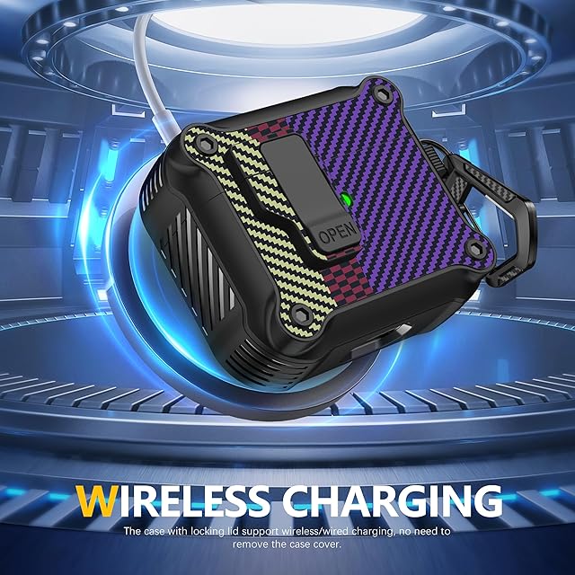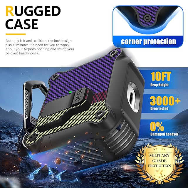 商品名:RFUNGUANGO Airpods 第 3 世代用ケース、安全なロック クリップ付き、フルボディ耐衝撃ハードシェル保護、 AirPod 第 3 世代 2021 用 AirPods 3 ケース [フロント LED 可視] - カーボンファイバー パープル