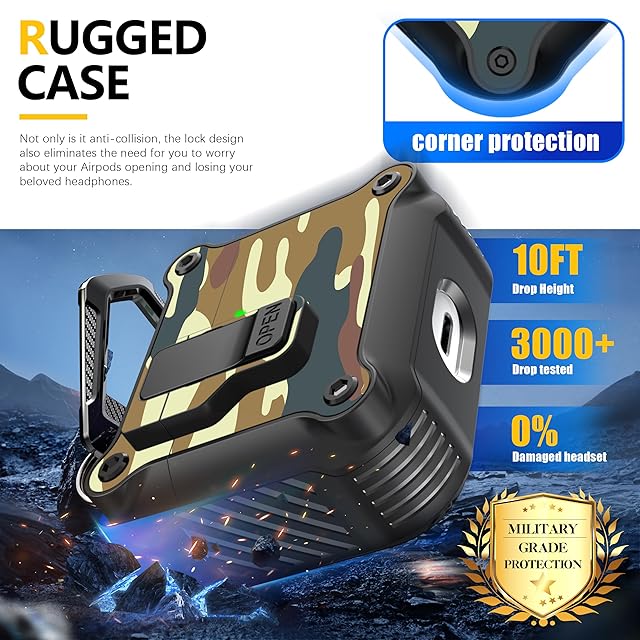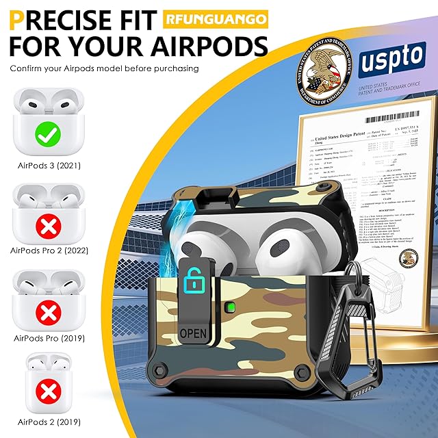 商品名:RFUNGUANGO Airpods 第 3 世代用ケース、安全なロック クリップ付き、フルボディ耐衝撃ハードシェル保護、 AirPod 第 3 世代 2021 用 AirPods 3 ケース [前面 LED 可視] - 砂漠迷彩