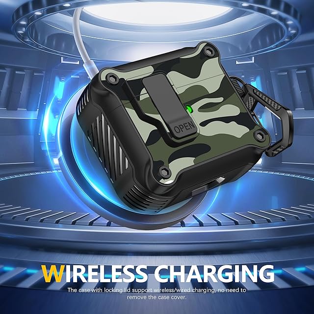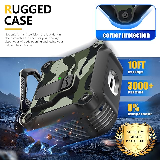 商品名:RFUNGUANGO Airpods 第 3 世代用ケース、安全なロック クリップ付き、フルボディ耐衝撃ハードシェル保護、 AirPod 第 3 世代 2021 用 AirPods 3 ケース [前面 LED 可視] - グリーン迷彩