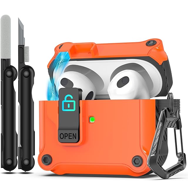RFUNGUANGO Airpods 第 3 世代用ケース、安全なロック クリップ付き、フルボディ耐衝撃ハードシェル保護、 AirPod 第 3 世代 2021 用 AirPods 3 ケース [前面 LED 可視] - オレンジ