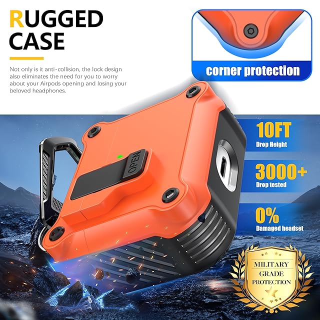 商品名:RFUNGUANGO Airpods 第 3 世代用ケース、安全なロック クリップ付き、フルボディ耐衝撃ハードシェル保護、 AirPod 第 3 世代 2021 用 AirPods 3 ケース [前面 LED 可視] - オレンジ