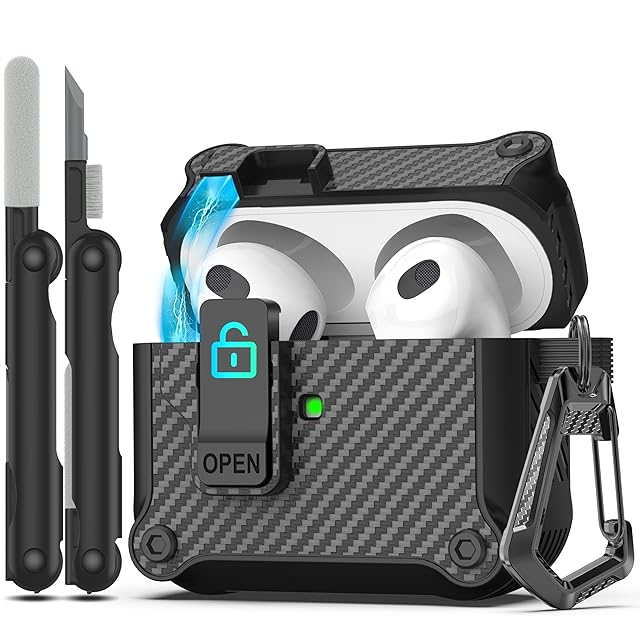【ユニークなセキュリティロック】アップグレードされたセキュリティロック設計により、開閉が簡単になります。「開く」ボタンを押すと、ケースの上部が自動的に開きます。 Airpods 3 を簡単に持ち運ぶことができます。AirPods 充電ケースをしっかりと閉じた状態に保ち、カバーが落ちることはありません。