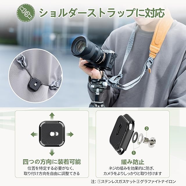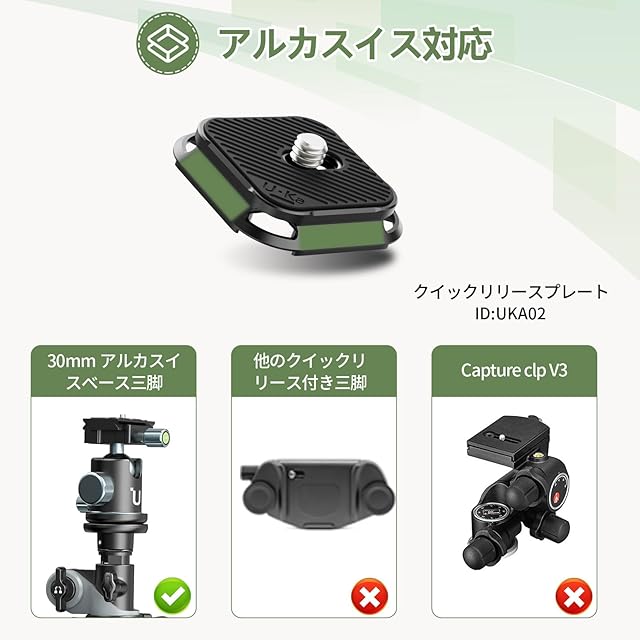 【Arca対応互換】UKA02プレートはアルカスイス38mm標準が付属しており、アルカスイス規格のアクセサリーと互換性があります。四角形プレートは四つの方向に自由に装着可能、カメラの位置を特定する必要がなく、取り付け方向を自由に調整できます。