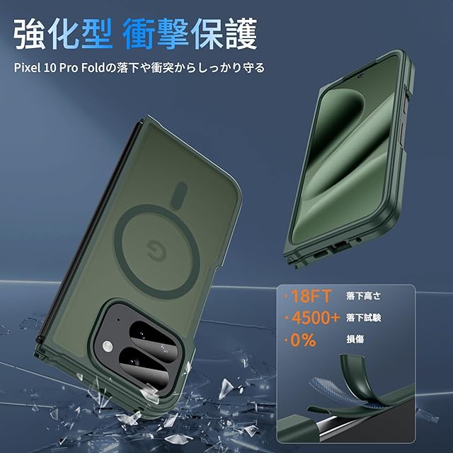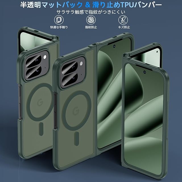 Pixel 10 Pro Fold ケース【MagSafe対応】 耐衝撃 米軍MIL規格 半透明 黄変防止 指紋防止 ワイヤレス充電対応 強化フロントカバー (グリーン)