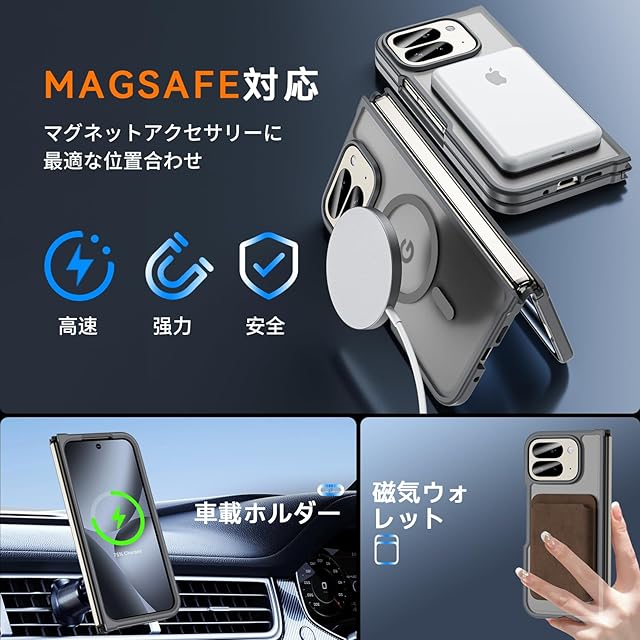【MagSafe対応】Fin2feelのGoogle Pixel 10 Pro Fold ケースは、2400ガウスの磁力と18Nの引力で確かな吸着力を提供します。googleピクセル10 Pro Fold ケースを装着したままでワイヤレス充電が可能で、MagSafeアクセサリーとの互換性もあります。車載ホルダーや他のMagSafeアイテムにも対応しており、どんな場面でも快適に使用できます。MagSafeバッテリー、MagSafeカードケース、MagSafeワイヤレス充電器、MagSafeリング、MagSafe車載ホルダーなど、MagSafeを使用するシーンに対応した Pixel 10 Pro Fold ケースなので、Magsafeの便利さを満喫しましょう!