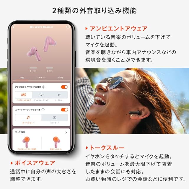 商品名:JBL WAVE BEAM 2 ワイヤレスイヤホン アクティブ ノイズキャンセリング IP54 防水防塵 マルチポイント 最大40時間 (ピンク)