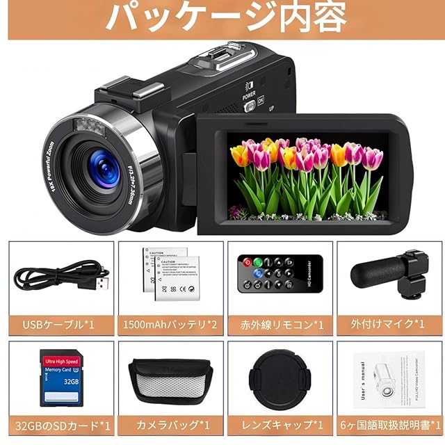 商品名:ビデオカメラ 4K録画 8000万画素 Vlogging カメラ 3.0"IPS HDスクリーン IRナイトビジョン 18倍デジタルズーム 270度回転可能 画面 自撮り 32GBのSDカード MIC外部マイク 1500mAhリチウムイオン電池 リモコン 付き 6ヶ国語取扱説明書 YouTubeカメラ 旅行Vlog 軽量 携帯便利 卒業式 学生 初心者 セット