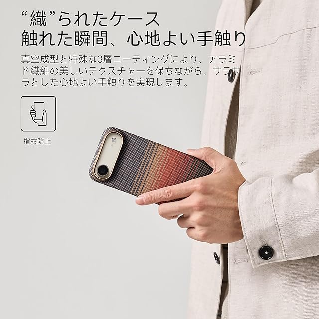 【超薄iPhone Air本体に相応の薄型ケース--持っていないような装着感】画期的なアンバーマグネットフィルム技術を採用したこのスマホケースは、驚くほど薄くて軽い設計になっています。またその薄型設計は、ポケットやバッグに収納する際の邪魔にならず、日常生活での利便性を損なうことはありません。マグネット対応ケースの中でもっとも薄く、かつ軽いケースと誇ります。ケースを装着していないかのように軽く、薄い装着感でしっかり保護します。紙のように薄く、鉄のように強いこのケースは今までスマートフォンを裸のままで使用していた方々の新たな選択肢となるでしょう。【対応機種】iPhone Air用ケース 6.5インチ。(PITAKA iPhone Air用ケースは独自開発のPitaTapボタンが含まれておりません。)
