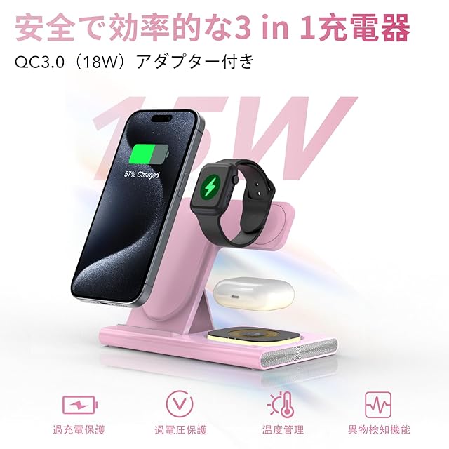 商品名:【最新型】HATALKIN 3in1ワイヤレス充電器 Compatible with iPhone17/17 Air/17 Pro/17 Pro Max/16/15/14/13/AirPods 4/Pro 3/Pro2/Apple watch Series 11/Ultra 3/ultra 2/10/9/7/8/SE 3/se2 同時充電 折りたたみ 置くだけ QC3.0アダプター付属(ピンク)