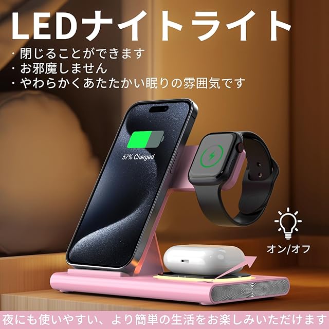 【便利性】最新のApple watch Ultra 3/ultra 2 /series 11/10/9/8//SE 3/iPhone17/17 Air/17 Pro/17 Pro Max/16/15/14/AirPod 4置くだけで同時充電できます。頻繁にコネクターの抜き差しの必要がありません。人体工学設計の45度斜角の設計で、さらに幅広い充電領域により、垂直と水平状態での充電が可能に。充電しながら映画を見ることできます。