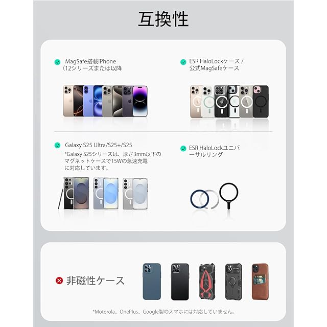 【認定急速充電】: 公式Qi2認定の15W MagSafe iPhone充電のため、より確実で信頼性の高い高速充電を提供します。最適な充電のために、付属ケーブル(≧20W USB-C - C充電器)を使用してください。公式MagSafeケースまたはESR磁気ケースの使用を推奨します。また、Motorola、OnePlus、Googleの一部機種(Pixel 10 / Pixel 10 Pro / Pixel 10 Pro XL除く)はマグネットワイヤレス充電には非対応です。