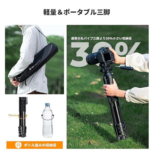 コンパクトなデザイン:五角形のチューブ構造を採用した軽量三脚は、その斬新な外観により、折りたたみと収納が簡単です。三脚の重量はわずか1.3kg、折りたたみ時のサイズはわずか46cmで、携帯性に優れ、屋外での撮影や旅行、普段使いに適しています。