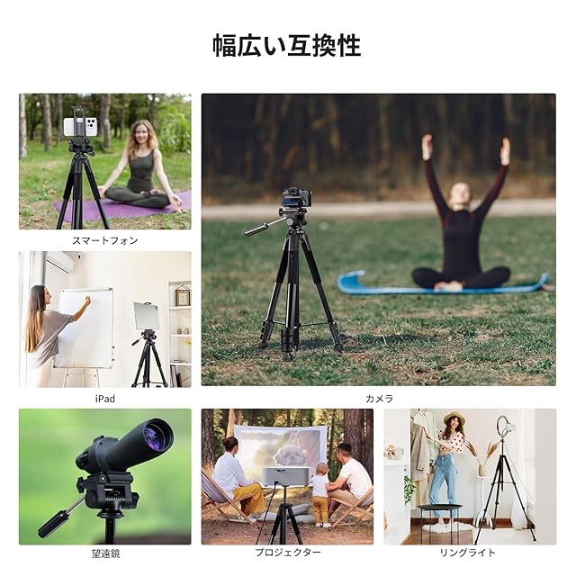 多彩な互換性:三脚には、クイックリリースプレート、携帯電話タブレットホルダー、Bluetoothリモコンが付属しており、携帯電話、タブレット、MSLR、一眼レフカメラ、その他のデバイスとの幅広い互換性をします。