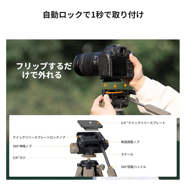 フレキシブルな撮影アングル:三脚の3ウェイ雲台の耐荷重は4kg。雲台は水平方向に360°回転し、チルト角は-70°から+100°まで調整可能です。また、クイックリリースプレートは水平および垂直の撮影に使用でき、マルチアングル撮影の要件を満たします。