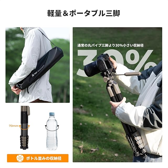コンパクトなデザイン:軽量な三脚は五角形のチューブデザインで、その斬新な外観により折りたたみと収納が簡単です。三脚の重量はわずか1.2kg、折りたたみサイズはわずか46cmです。携帯性に優れ、アウトドアの撮影や旅行、桜祭り、お花火大会、紅葉祭りの撮影に適しています。