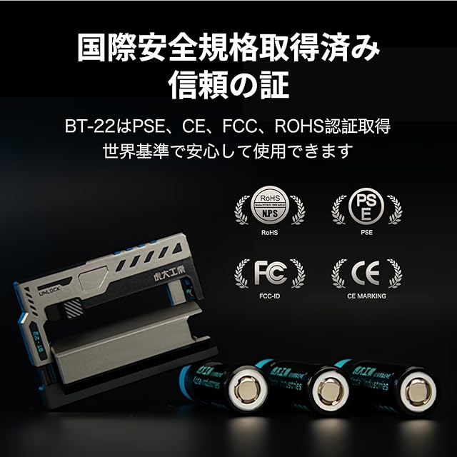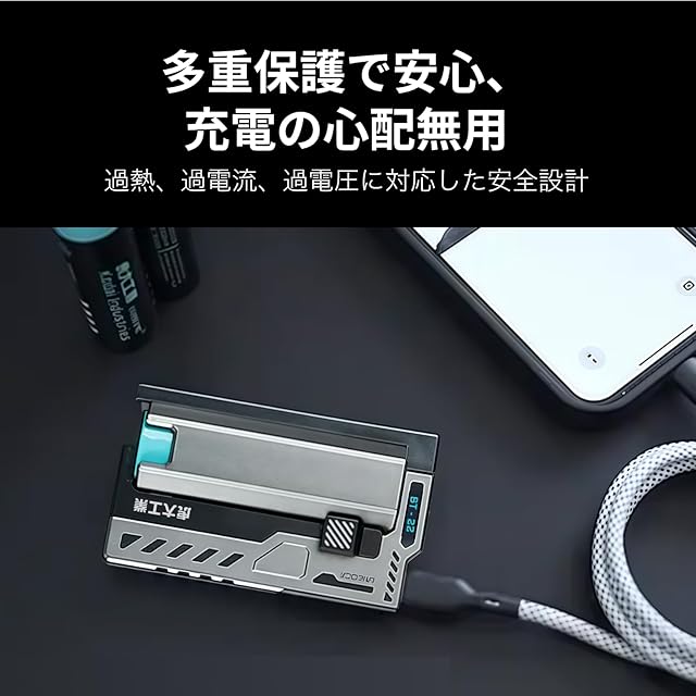 【製品仕様】<br> 型番:BT-22<br> 出力(電池):4.2V-2.5A Max<br> 出力(Type-C): 5V-3A、9V-2.2A、12V-1.67A<br> 入力(電池充電):5V-2.2A<br> 重量:38+2g<br> サイズ:85×49×24.5mm<br> 適用電池:INR 21700・20700・18650(変換アダプタが必要)<br> パッケージ内容:本体・説明書・1メートル充電ケーブル・絶縁テープ (電池二本セットと電池四本セットは5000mAhの電池及び電池収納袋が付いています。)<br>