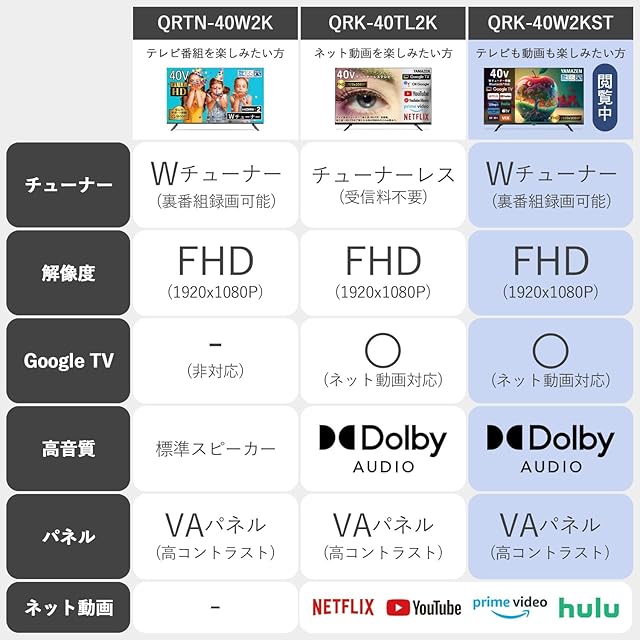 商品名:山善 テレビ Wチューナー 液晶 40インチ フルハイビジョン QRK-40W2KST ネット動画対応