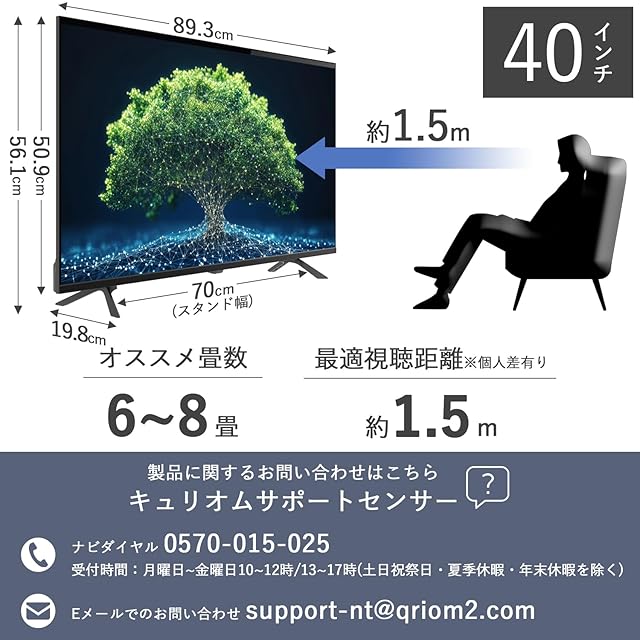 ✅【商品仕様】◇本体寸法:[スタンドなし]893×82×509mm [スタンドつき]893×198×561mm ◇本体質量:[スタンドなし]5.5kg [スタンドつき]5.6kg ◇画面サイズ:40V型 ◇解像度:1920×1080 ◇コントラスト比:5000:1 ◇視野角(標準値):左右約178°/上下178° ◇応答速度:9.5ms ◇チューナー:地上デジタル×2、BS、110度CSデジタル×2(ダブルチューナー)※1つは視聴専用・2番組同時録画は非対応 ◇音声出力(スピーカー):6W+6W ◇Bluetoothバージョン:5.1 ◇壁掛け寸法:VESA規格200×200mm ◇USB端子:USB2.0×2 ◇定格電源:AC100V-240V(50/60Hz) ◇消費電力:60W ◇付属品:リモコン、リモコン用単4形乾電池×2(動作確認用)、miniB-CASカード、miniAV交換アダプター、スタンド、スタンド固定ネジ×4、書付き取扱説明書