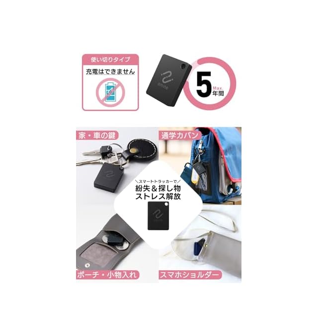 【充電せず5年間使える】充電や電池交換がいらない使い切りタイプ。長寿命設計で、財布やパスケースなどに入れたままの状態で最大5年間使うことができます。 ※バッテリーの稼働時間は接続状態での最大値です。音を頻繁に鳴らすなどご利用方法によっては稼働時間が短くなります。