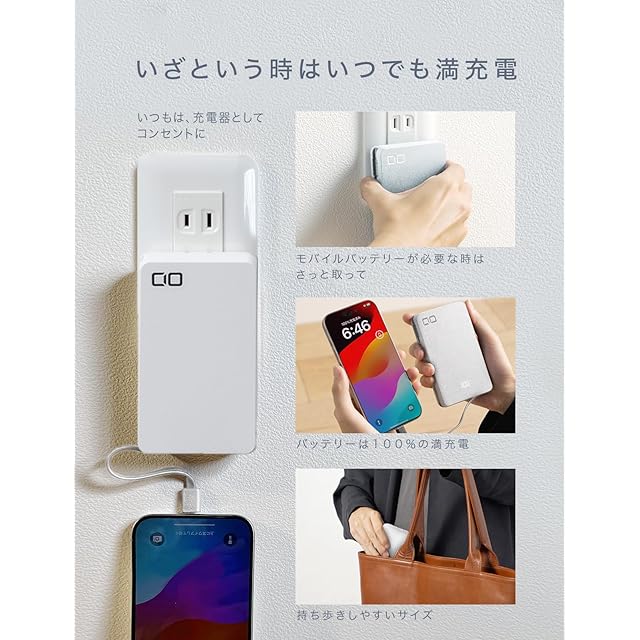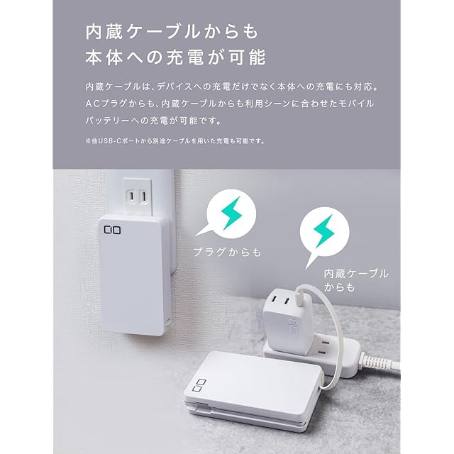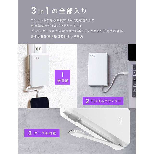 【着脱可能なケーブル付きだから個別のケーブル不要】ケーブルが本体に内蔵されている為、スマホの充電時も、モバイルバッテリーの充電時も別途ケーブルが不要です。内蔵ケーブルは着脱式なので、もしものケーブル断線時もケーブルだけの交換が可能で長くご愛用頂けます。内蔵ケーブルはバッテリー本体への充電にも対応しているので、環境に応じてコンセントから、または充電器を用いてケーブルからの充電もできるので、安心してご使用いただけます。