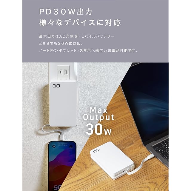商品名:CIO モバイルバッテリー コンセント一体型 ケーブル内蔵 3in1 タイプC 30W 8000mAh 軽量 小型 薄型 iPhone 17 / 16 / 15 / Android/Macbook/ノートPC/iPad用 USB Type-C 急速充電 SMARTCOBY Ex03 SLIM PLUG & CABLE (ホワイト)