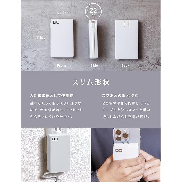 【ケーブル内蔵で持ち運びにも。重ね持ちにも最適】サイズは約115×67.5×22mmで重量は約223gのスリムで軽量。ちょっとしたすき間に入れて持ち運べるので荷物がかさばりません。内蔵ケーブルの長さも約172mmあり、重ね持ちにも最適です。