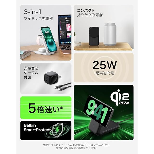 Belkin Qi2 25W Ultra Charge ワイヤレス充電器 世界初 25W充電スタンド 3 in 1 スクエアモデル Qi2公式認証/MagSafe対応 急速充電対応 iPhone 17,16~12 Apple Watch アップルウォッチ Google pixel 10 PRO XL対応 折りたたみ可能 持ち運びにも最適 ホワイト WIZ036dqWH