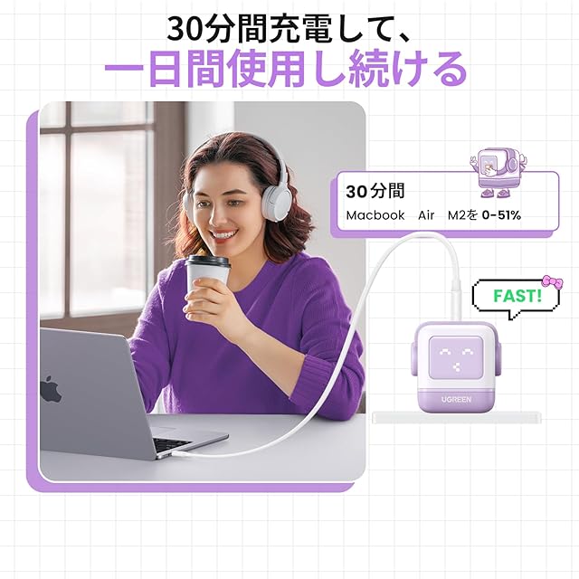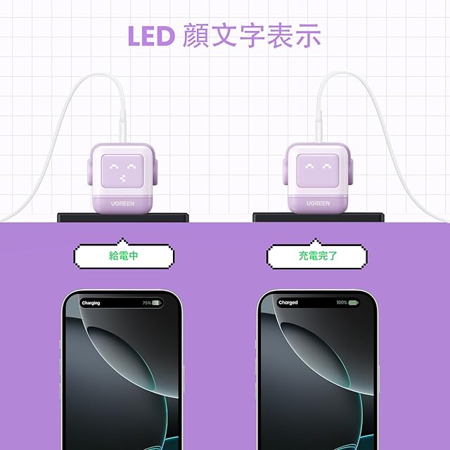 【ロボットの表情で充電の状態をお知らせ】UGREEN Unoタイプc 充電器はLCDスクリーンを搭載、ロボットの表情で充電状態がわかります。充電中は目・口で笑顔を表現し、フル充電になると目だけの笑顔になるので、ひと目で充電状況を把握できます。さらにブーツ部分はマグネット付き、スチール家具に付けるなど便利にご利用いただけます。持ち運びやすいようデザインしているので、カバンに入れて引っかかったり折れたりなどの心配もありません。 .