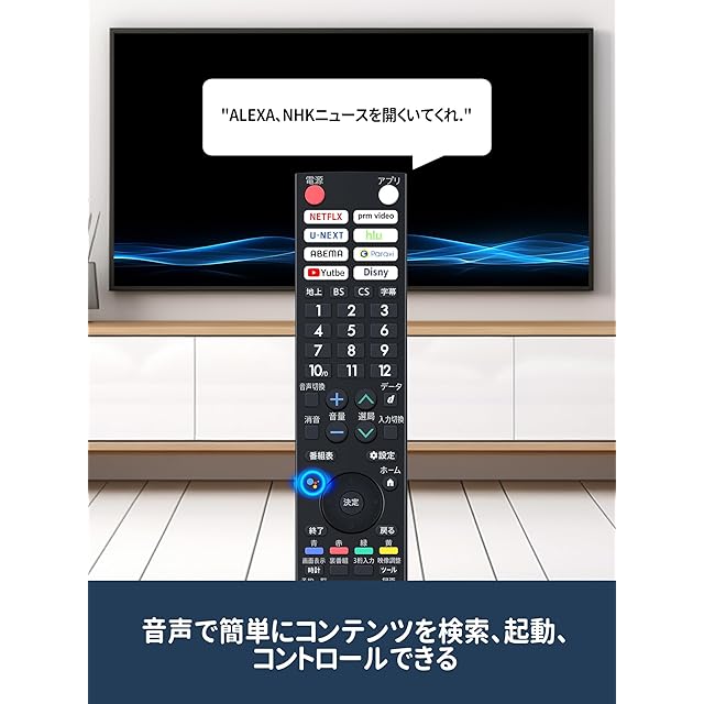 【音声認識機能付き】リモコンは音声検索が可能で、音声認識ボタンを押しながらリモコンに話しかけることで、好きなタイトルの検索や再生を操作することができます。