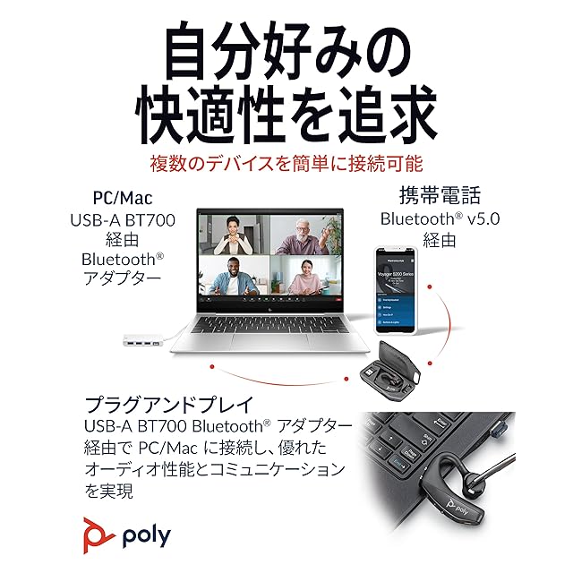 商品名:PLANTRONICS Poly(ポリー) Voyager 5200 Bluetooth ワイヤレスヘッドセット 片耳 モノラルイヤホンタイプ PC接続用 BT700ドングル 専用充電ケース付属 ノイズキャンセリングマイク PC/スマートフォン対応 国内正規品2年