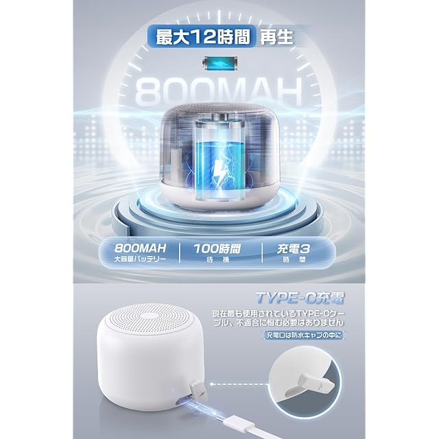 商品名:【Bluetooth スピーカー&大音量】ブルートゥーススピーカー 防水 耐衝撃 ワイヤレス小型 お風呂 12時間連続再生 急速充電 IPX7 ぶるーとぅーすすぴーかー ハンズフリー通話 マイク内蔵 ストラップ付き ミニ片手 コンパクト USB-C接続 プレゼント アウトドア/キャンプ/釣り/ゲーミング/通話/車載 Android/iPhone対応(ホワイト)