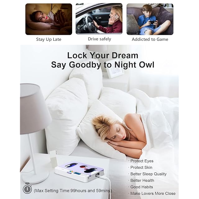 「タイムロッキング」タイムロックボックスの蓋にタイマー式の鍵が付いて、最短1分から最長99時間59分までタイマーをかける可能です。スマホを触りすぎて時間が浪費してることに危機感を覚えて、設定した時間になるまで蓋が開けられないのです。ご注意:スマホロックボックスを受け取ったら、まず充電にしてお願いいたします。